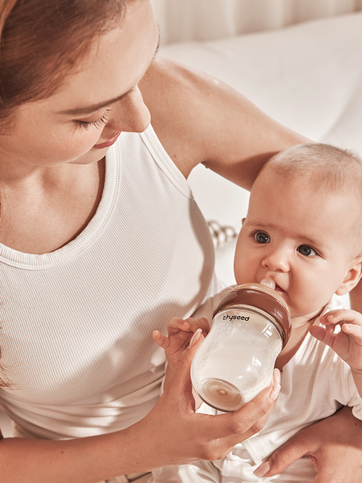 Бутылочки для кормления Thyseed изготовлены из премиального боросиликатного стекла. Они безопасны, не содержат бисфенол-А и другие вредные вещества. Соски Thyseed изготовлены из ультрамягкого силикона (твёрдость 20 по шкале Шора) и имеет форму, повторяющую форму маминой груди, делая кормление из бутылочки максимально приближенным к грудному вскармливанию и облегчая переход от грудного вскармливания к бутылочке.