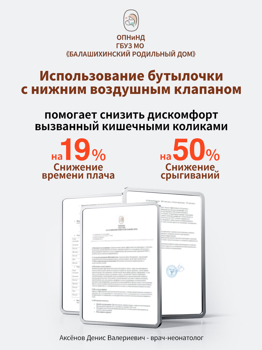 Запатентованный воздушный клапан на дне не допускает прохождение воздуха через молоко/молочную смесь, предотвращая образование пузырьков воздуха в молоке/молочной смеси и появление колик у малыша.